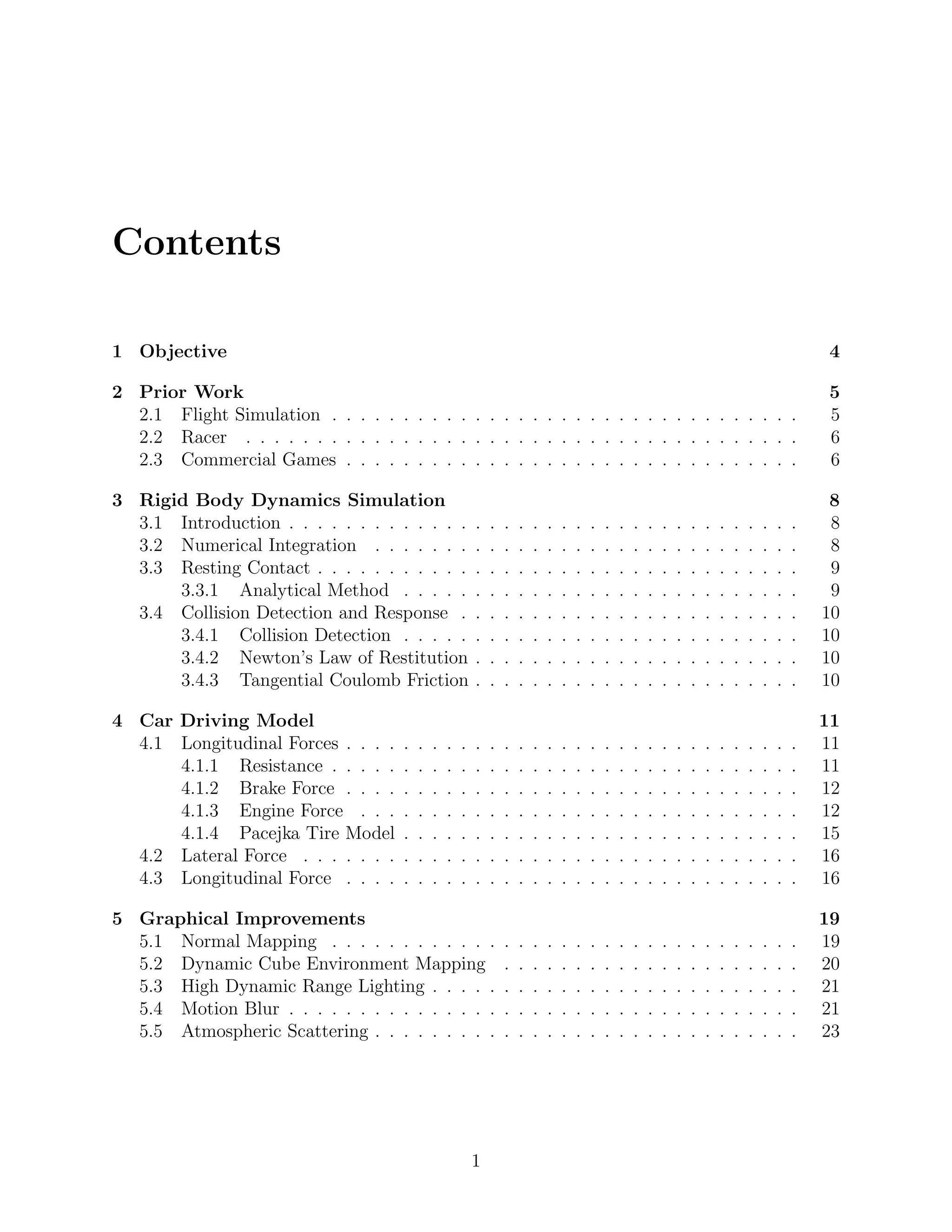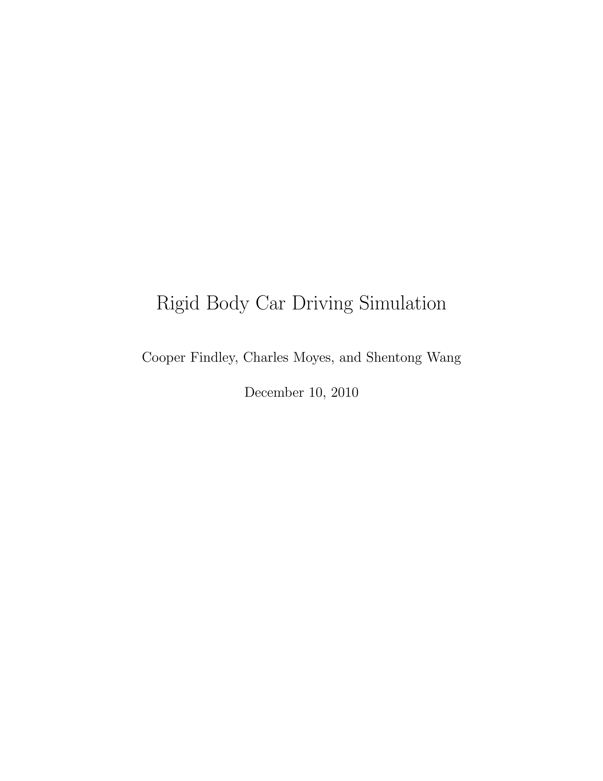This document describes a project to create a realistic car driving simulation using rigid body dynamics and physics modeling. It outlines the objectives to physically simulate driving a car using a 3D OpenGL environment. The simulation will include realistic graphics rendering, as well as modeling forces like braking, acceleration and tire traction. It discusses prior work in flight and racing simulations and the techniques that will be implemented, such as bump mapping, environment mapping, lighting effects and motion blur. The document also covers integrating controls, sound and developing a racing game interface. Overall goals are to achieve high simulation accuracy and stability for a realistic driving experience.