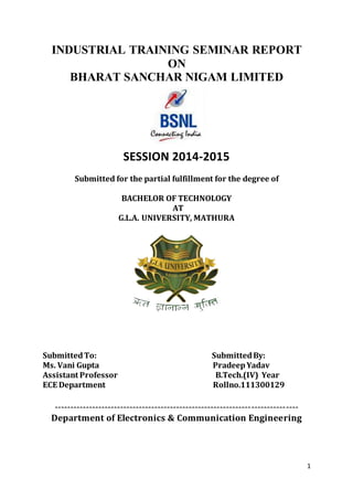The document discusses Bharat Sanchar Nigam Limited (BSNL), India's state-owned telecommunications company. It covers the basic workings of a telecommunications network, components of BSNL exchanges like the main distribution frame, and mobile communication technologies used by BSNL like GSM, GPRS, CDMA. The document also discusses internet services provided by BSNL including broadband, WiMAX, FTTH and provides an overview of optical fiber transmission systems.