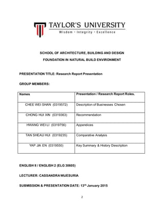 This document provides a research report comparing two hardware businesses in Malaysia: Perniagaan Gluck located in Subang Jaya, and Cemerlang Indah Hardware located in Port Dickson. The report includes descriptions of the businesses, a comparative analysis of their operations, products, customers, and strategies for combating competition. It concludes that Perniagaan Gluck has greater potential for success due to its innovative online expansion plans and focus on adapting to customer needs, while Cemerlang Indah Hardware relies more on traditional methods. Recommendations are made to help Perniagaan Gluck determine the feasibility of its online business strategy and address any weaknesses.