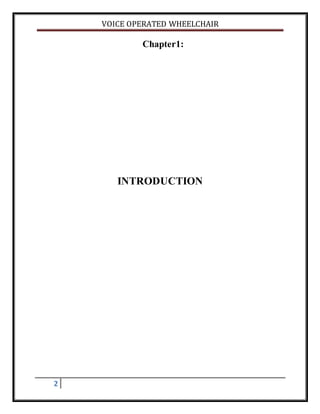 This document describes a voice-operated wheelchair system that allows disabled users to control a wheelchair through voice commands. The system uses a microcontroller, wireless microphone, voice recognition processor and motor control interface to integrate voice command functionality. It is trained to recognize basic movement commands like forward, reverse, left and right. When a user speaks a command into the microphone, the voice recognition processor detects the word and sends the corresponding signal to the microcontroller to drive the motors and move the wheelchair. This system is designed to give wheelchair users independence by enabling control through their voice.