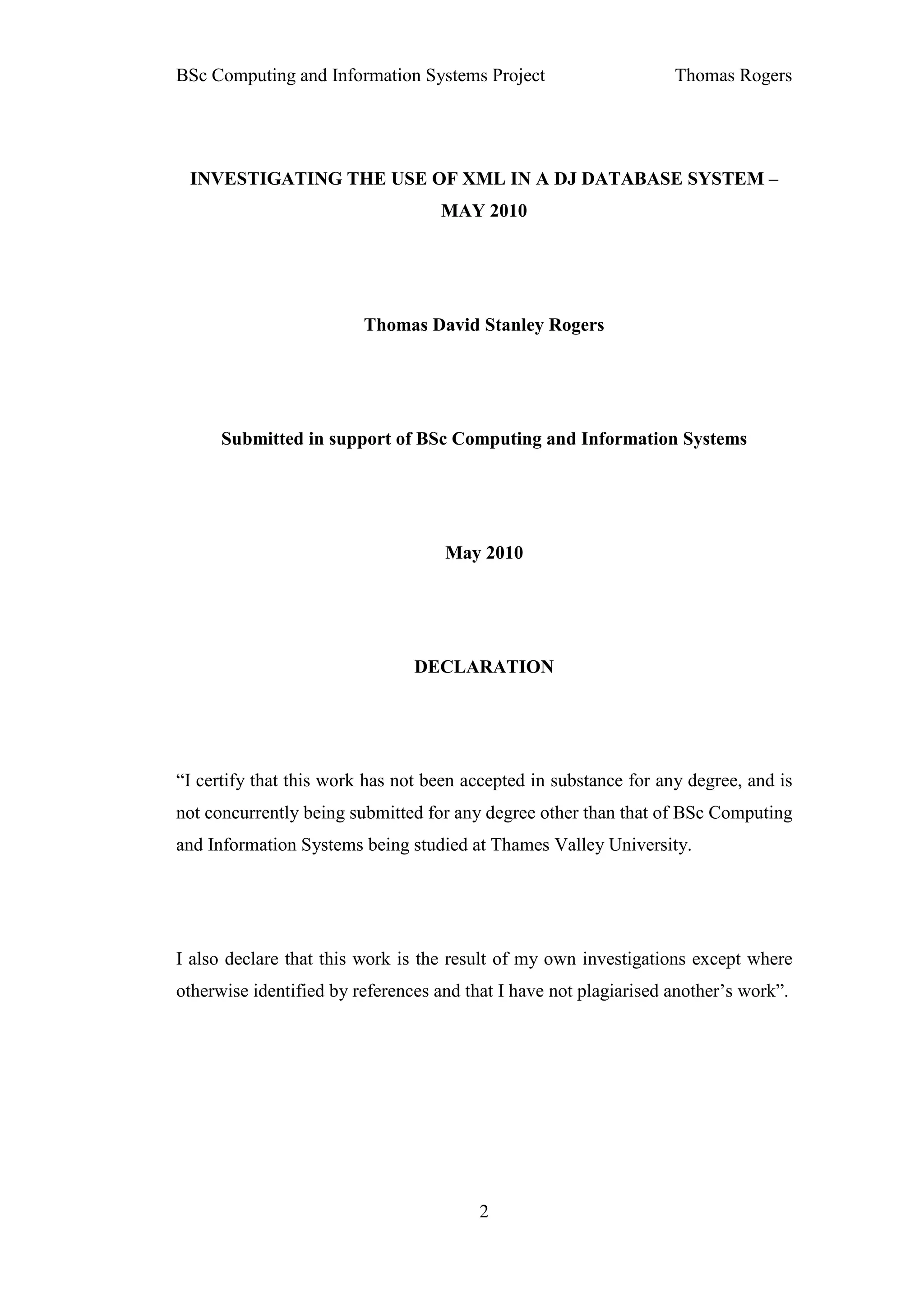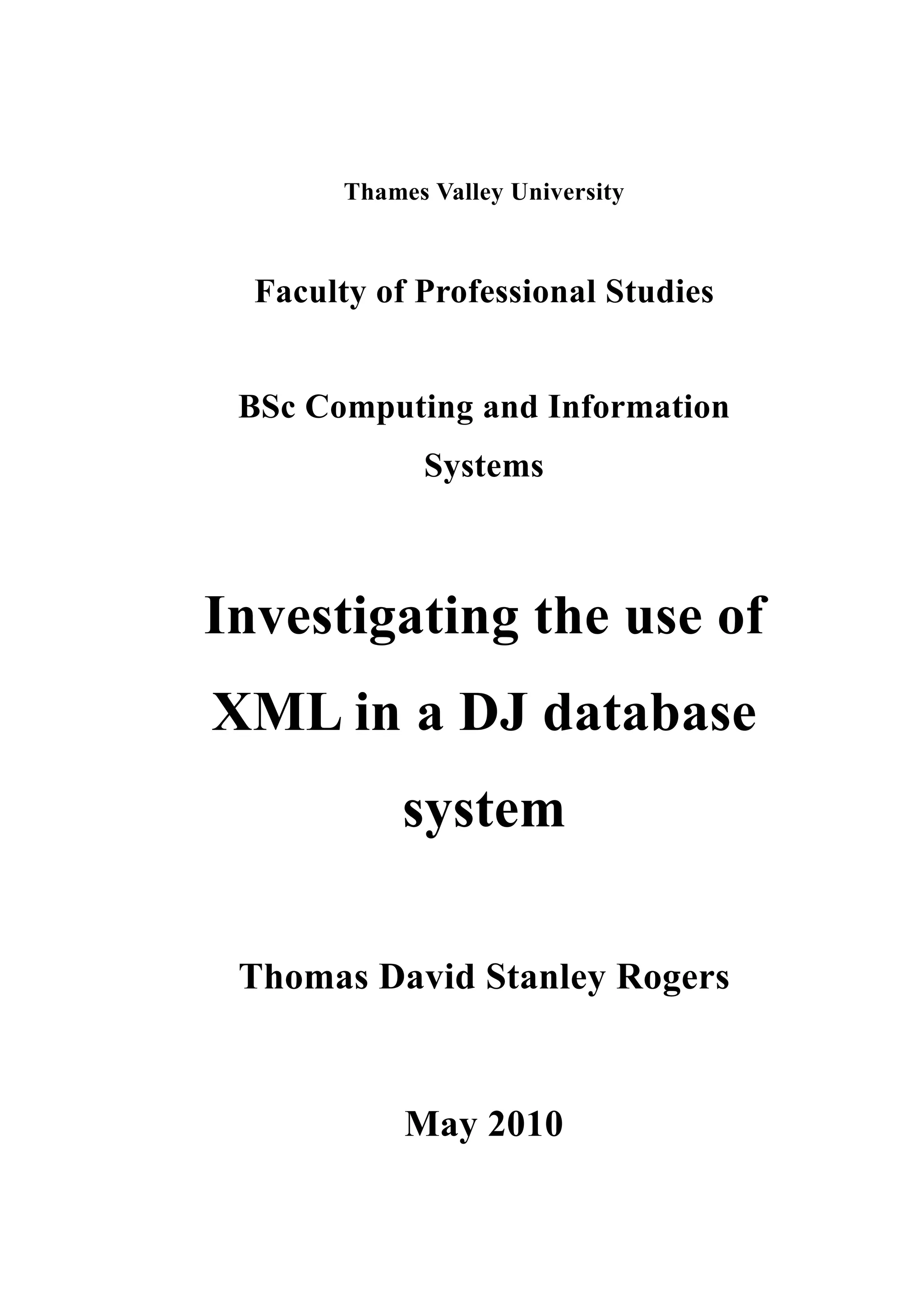 The document discusses the use of XML in a DJ database system project. It begins with a literature review that explores semi-structured data and the role XML plays in handling it. XML allows for flexible hierarchical data structures that are well-suited for semi-structured data. The research then compares native XML databases and XML-enabled relational databases for storing XML documents. The remainder of the document details the development of a prototype XML PHP forum application that allows users to upload and download semi-structured feedback and media related to DJ performances. Requirements, design, implementation, and testing are discussed in adherence to the DSDM methodology.