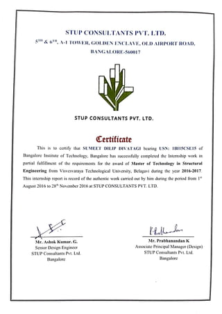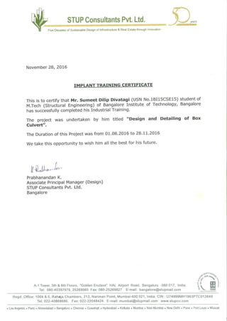 This internship report details the design and detailing of a box culvert completed by Sumeet Dilip Divatagi during the 2016-2017 academic year at Stup Consultants Pvt. Ltd. The report includes various chapters covering aspects such as hydrology, hydraulics, load calculations, and structural design, in addition to acknowledgments and guidance received throughout the internship. The work fulfills the requirements for a Master of Technology in Structural Engineering from Visvesvaraya Technological University.