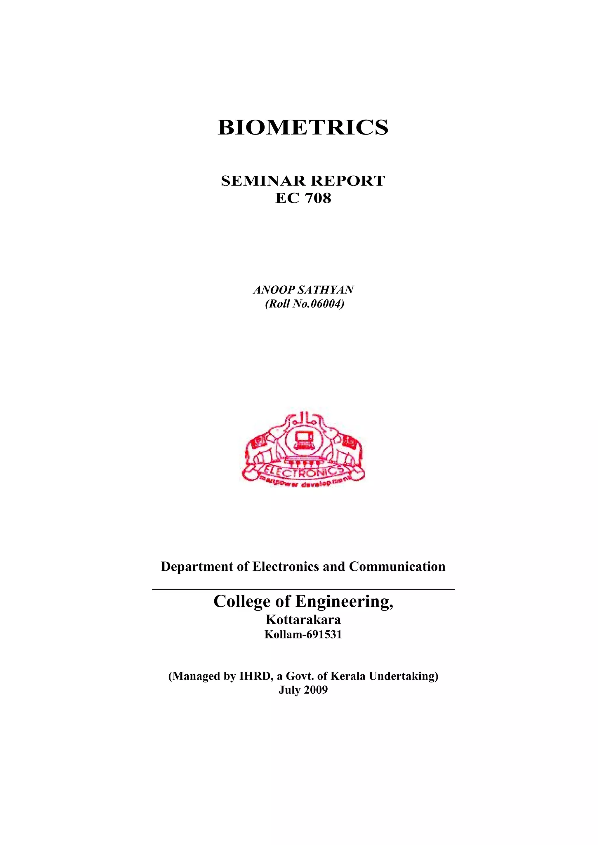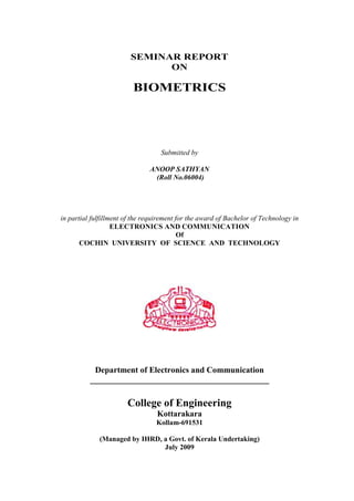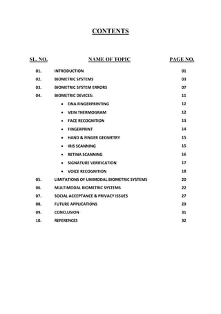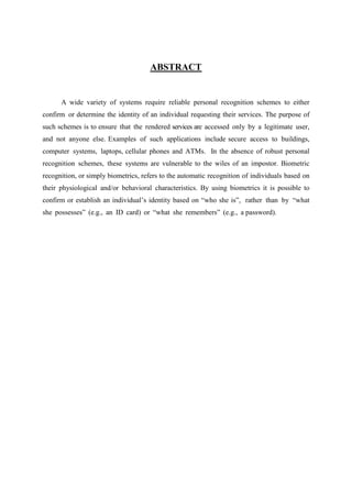 The document discusses biometrics and biometric systems. It defines biometrics as measurable biological characteristics that can be used to identify individuals. It then describes the main components of a biometric system, including sensors, feature extraction, matching, and databases. The document discusses verification and identification modes of biometric systems. It also explains the different types of errors that can occur in biometric systems, including false accepts and false rejects, and how performance is evaluated using metrics like FMR, FNMR, FTE, and FTC rates.