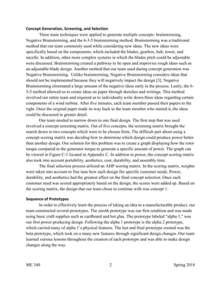 This document summarizes the design process of a small-scale wind turbine created by a team to power an ultrasonic mosquito repellent in Heredia, Costa Rica. The team generated concepts using brainstorming techniques and created prototypes to test designs. Their final "beta" prototype met all design criteria of producing 0.3W of power while being durable, portable, and aesthetically pleasing. The turbine was tested against a leaf blower to validate durability. Appendices provide suggestions for further improving the design and instructions for setup and use.