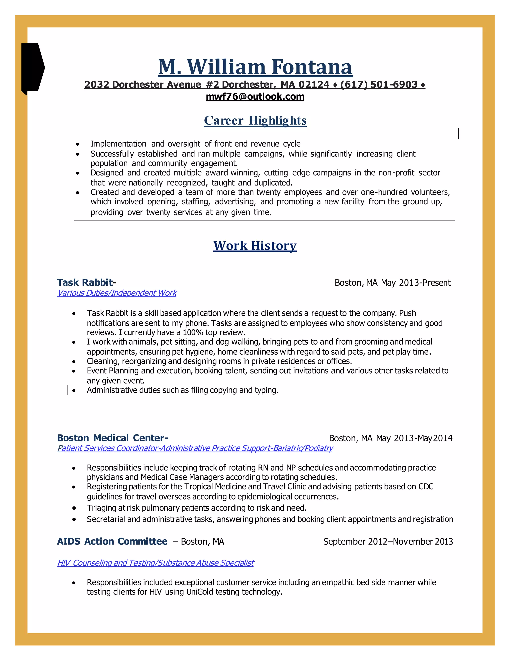 M. William Fontana has over 15 years of experience in healthcare administration, nonprofit work, and independent contracting. His career highlights include establishing multiple successful campaigns that increased client populations and community engagement. He has experience managing teams of employees and volunteers in settings such as healthcare facilities and nonprofits. Currently, he works independently on various tasks through the Task Rabbit platform, maintaining a 100% positive review rating.
