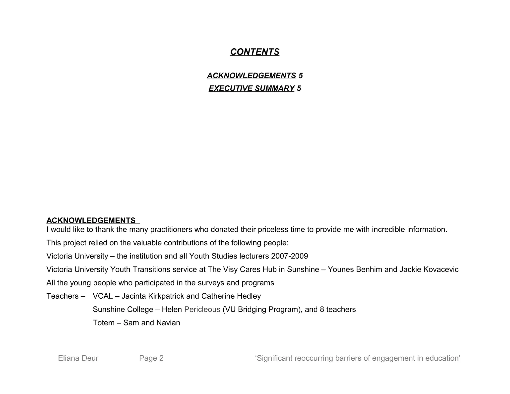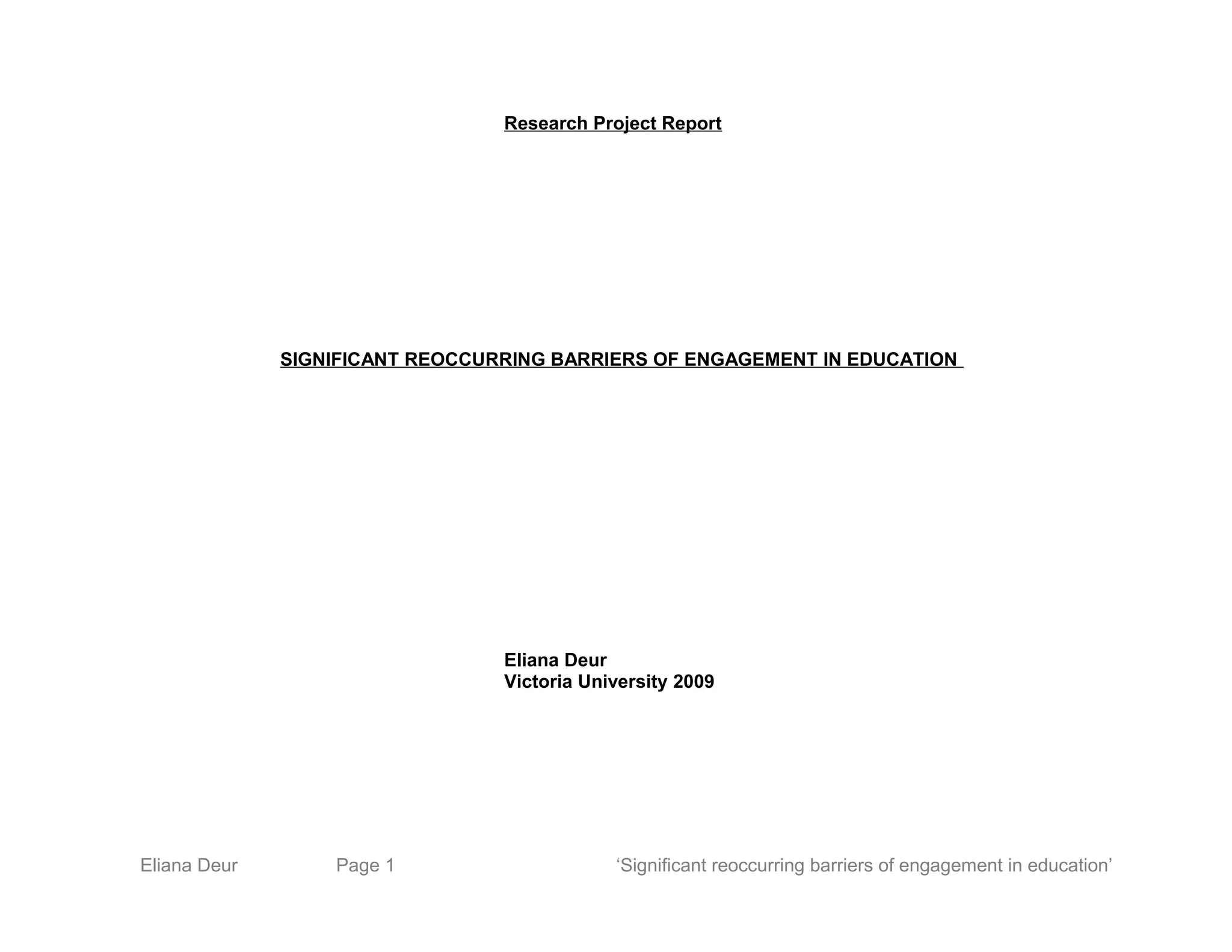 This research project examines barriers to education engagement for young people in Brimbank, Victoria. The researcher conducted literature reviews, surveys, focus groups, interviews, and case studies. The research found that lack of appropriate education and support, family disconnection, mental health issues, poverty, and low academic achievement were significant recurring barriers. The community of Brimbank has high rates of poverty, unemployment, and residents without higher education qualifications compared to state averages. To overcome these barriers, the research suggests early intervention, long-term skill-building programs, and individualized case management supports for young people.