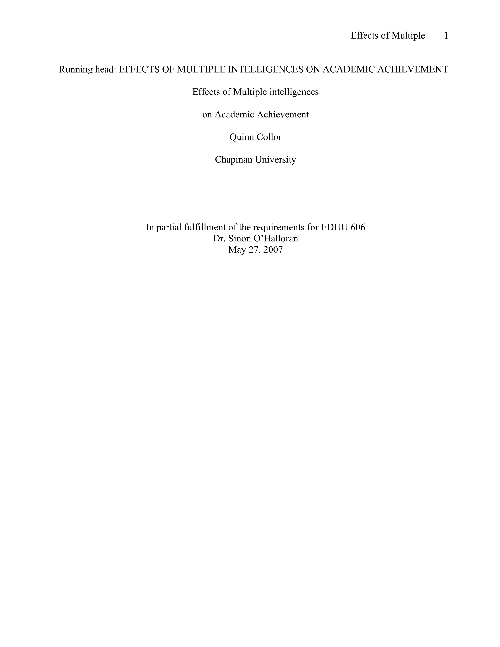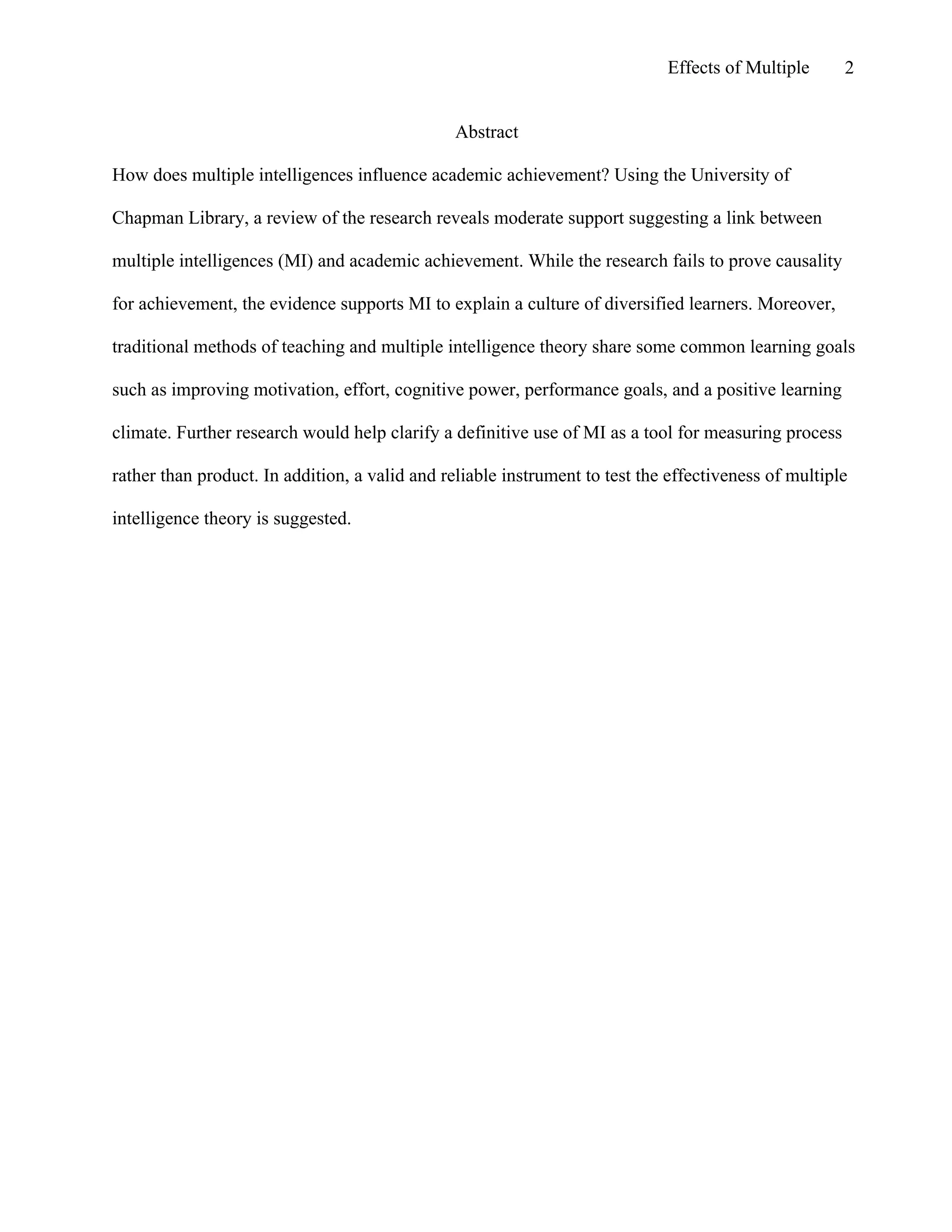 The document reviews research on the influence of multiple intelligences (MI) on academic achievement, suggesting moderate support for a link between MI and improved learning outcomes. It discusses various studies, including brain-based learning and cooperative methods aligned with MI theory, but highlights a need for valid instruments to measure MI effectively. Finally, it argues that future research should focus on high-quality learning processes rather than solely on quantifiable academic results.