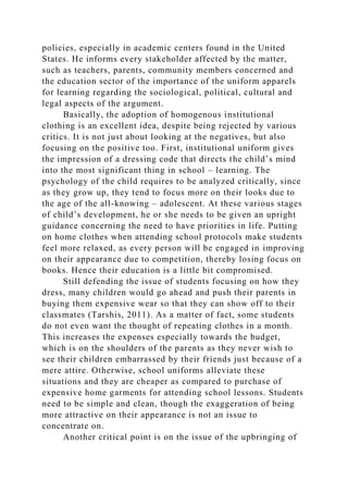 This research paper examines the role of school uniforms in children's education and upbringing, arguing that a uniform dress code promotes focus on learning and reduces socioeconomic pressures among students. It asserts that uniforms foster discipline and ethical behavior, preparing students for future professional attire standards. The ongoing debate is highlighted, with discussions on both the advantages and criticisms of adopting school uniform policies in educational institutions.