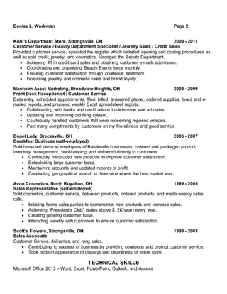 Denise L. Workman has over 15 years of experience in customer service, sales, and human resources. She has a Associate of Applied Business Degree in Human Resource Management from Cuyahoga Community College. Her most recent role is as a Smartshop Associate at American Greetings, where she assists employees in the corporate gift shop. Prior to that, she held various roles providing customer service and sales support, including as a Student Ambassador and Mentor at Cuyahoga Community College. She also has experience as a self-employed business owner.