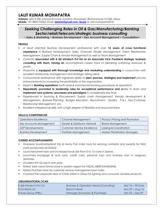 Lalit Kumar Mohapatra is a business development professional with over 15 years of experience in sales, marketing, business development, client relationship management, supply chain management, and team management. He is currently an Associate Vice President at K&B Infratech Pvt Ltd providing strategic business consulting. Previously he has worked at ICICI Bank Ltd as a Branch Head and in various roles at Future Group and Audiotronics. He holds an MBA and seeks challenging roles in industries such as oil & gas, manufacturing, banking, retail, and telecom.