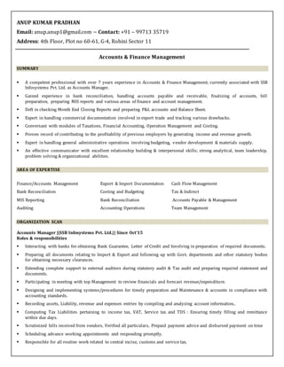 This document summarizes the resume of Anup Kumar Pradhan, who has over 7 years of experience in accounts and finance management. He is currently working as an Accounts Manager at SSB Infosystems Pvt. Ltd., where he handles tasks like bank reconciliation, accounts receivable and payable, financial reporting, and ensuring tax compliance. Prior to this role, he has worked in similar financial and accounting roles at other organizations. He has expertise in areas like financial accounting, costing, taxation, and using accounting software like Tally.