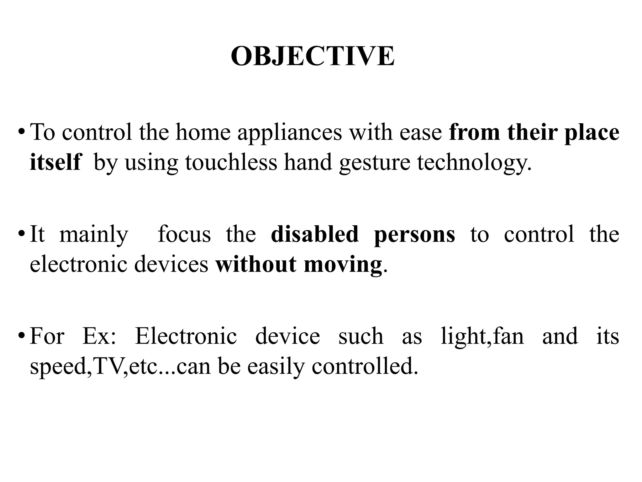 This document summarizes a project that uses touchless hand gesture motion technology to control home appliances. A gesture recognition chip detects hand motions and sends signals to a microcontroller. The microcontroller then operates relays connected to devices like lights and fans. This allows disabled people to control devices without physical contact. The system provides a low-cost and accurate alternative to existing gesture and voice control methods. It has applications for assisting elderly, sick, and handicapped individuals in smart homes.