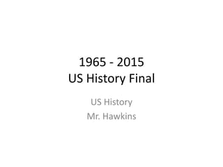 The document provides definitions for key terms related to events and people in US history from 1965 to 2015. It includes one to two sentence explanations of terms like stagflation, Helsinki Accords, affirmative action, Watergate, AIDS, supply-side economics, NAFTA, Patriot Act, and biotechnology.