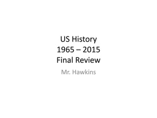 The document appears to be a review guide for a US History class from 1965 to 2015. It contains multiple choice and short answer questions about various topics covered during that time period, including the Nixon and Reagan presidencies, the 1970s divorce rate, the Camp David Accords, the Mariel boatlift, the Taliban being removed from power in Afghanistan after the US invasion, and trends in modern immigration to the US. The review guide is intended to help students prepare for a final exam on US History from 1965 to 2015.