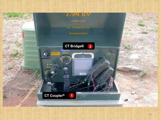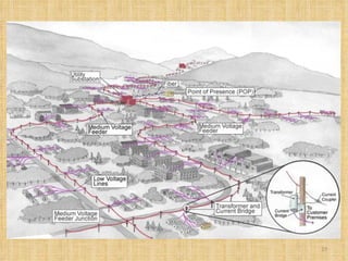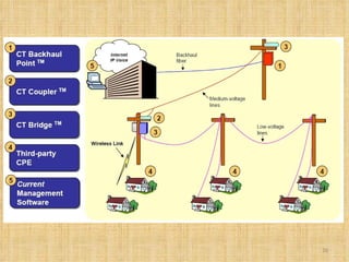 Broadband Over Power Lines (BPL) allows internet data to be transmitted over existing power lines, providing broadband access without requiring phone, cable, or satellite connections. BPL works by modulating radio waves with internet data signals and transmitting them onto medium-voltage power lines using technologies like OFDM to overcome noise. Special devices called injectors, repeaters, and extractors are used to introduce the signals, boost them at intervals, and deliver them to users through power transformers.