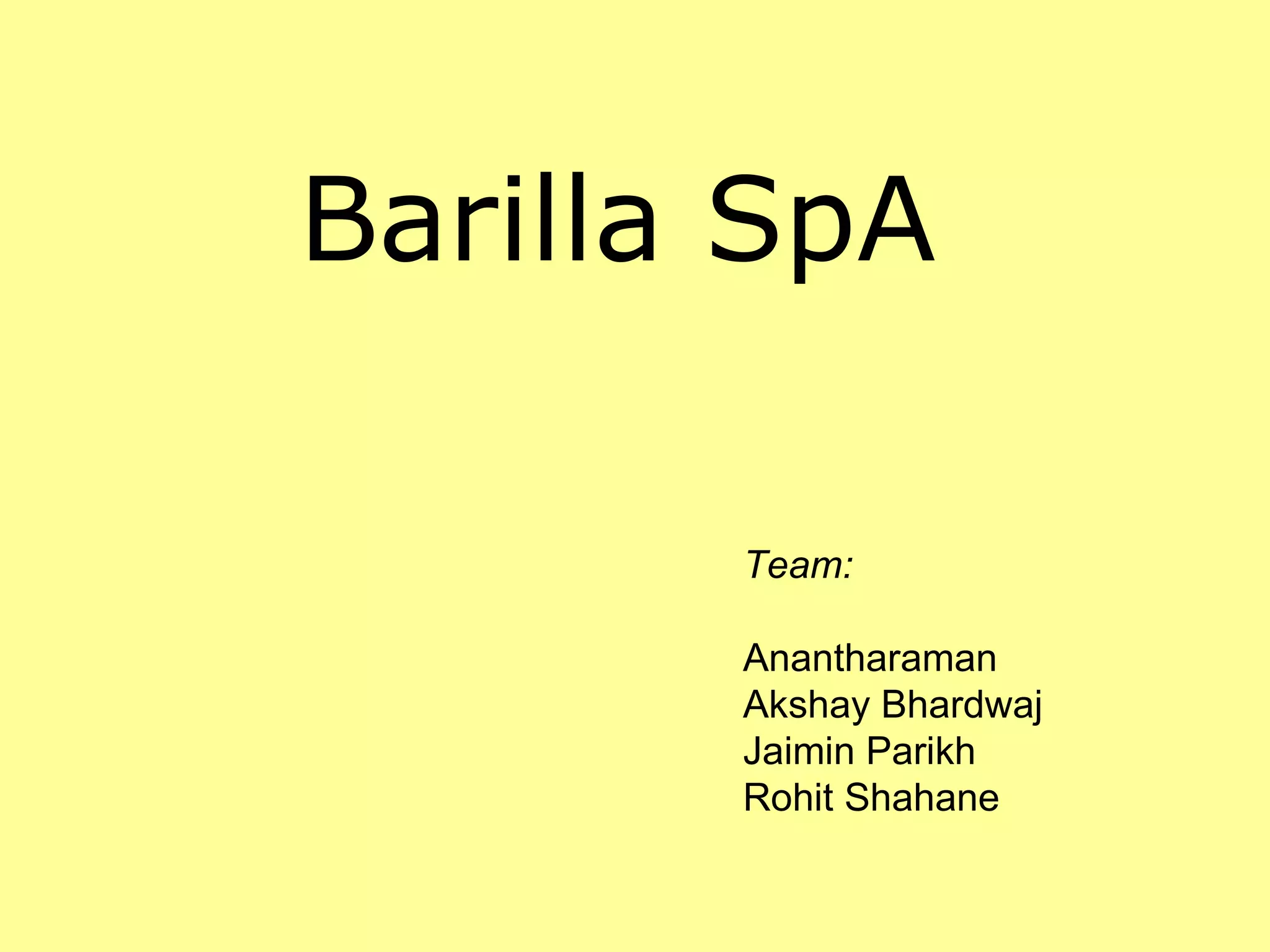 Barilla is the largest pasta manufacturer in the world with a 35% market share in Italy and 22% in Europe. It produces over 200 varieties of pasta along with other bakery products. The company was organized into several divisions but faced issues with poor communication, decentralized information flow, and inconsistent sales strategies. This led to thinning margins. To address this, the Director of Logistics proposed implementing a Just-in-Time Distribution system to improve demand forecasting, reduce inventory levels, and strengthen relationships between Barilla and distributors. However, the change faced resistance from some distributors and internal departments.