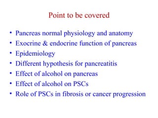 The document summarizes the effects of alcohol on the pancreas. It discusses how alcohol consumption can lead to pancreatic inflammation and fibrosis through several mechanisms. Chronic alcohol use can cause ductal obstruction from protein precipitates, increase the fragility of zymogen granules and lysosomes in acinar cells leading to premature enzyme activation and autodigestion, and induce oxidative stress. Alcohol metabolites also activate pancreatic stellate cells, which promote fibrosis through extracellular matrix deposition. Animal studies demonstrate models of pancreatic fibrosis induced by various insults like alcohol administration combined with caerulein injections or endotoxin exposure.