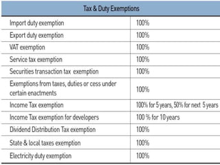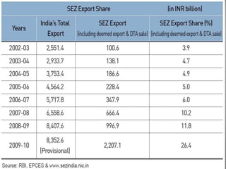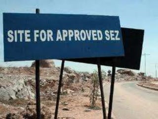 Special Economic Zones (SEZs) are geographical regions in India that have economic laws more oriented towards free market principles to increase foreign direct investment and GDP. SEZs cover various types of zones like free trade zones and industrial parks. They provide tax exemptions and other fiscal incentives. While SEZs aim to generate economic activity and jobs, there are concerns around land acquisition and impact on farmers' livelihoods. Overall, SEZs are intended to make India a more competitive investment destination but their success depends on factors like infrastructure and political stability.