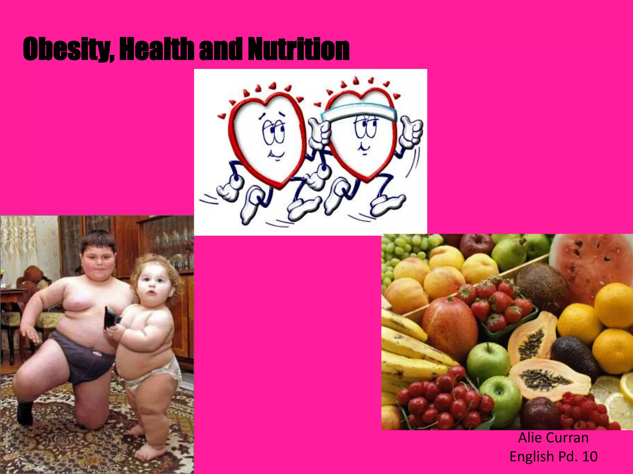 Obesity is a growing epidemic affecting many people. The presentation discusses the causes and health risks of obesity including increased risk of disease. It also discusses the importance of nutrition and exercise for maintaining a healthy lifestyle and weight. The presentation provides information on healthy eating habits, different types of exercise, and ways for people to monitor their weight and diet in order to prevent obesity.