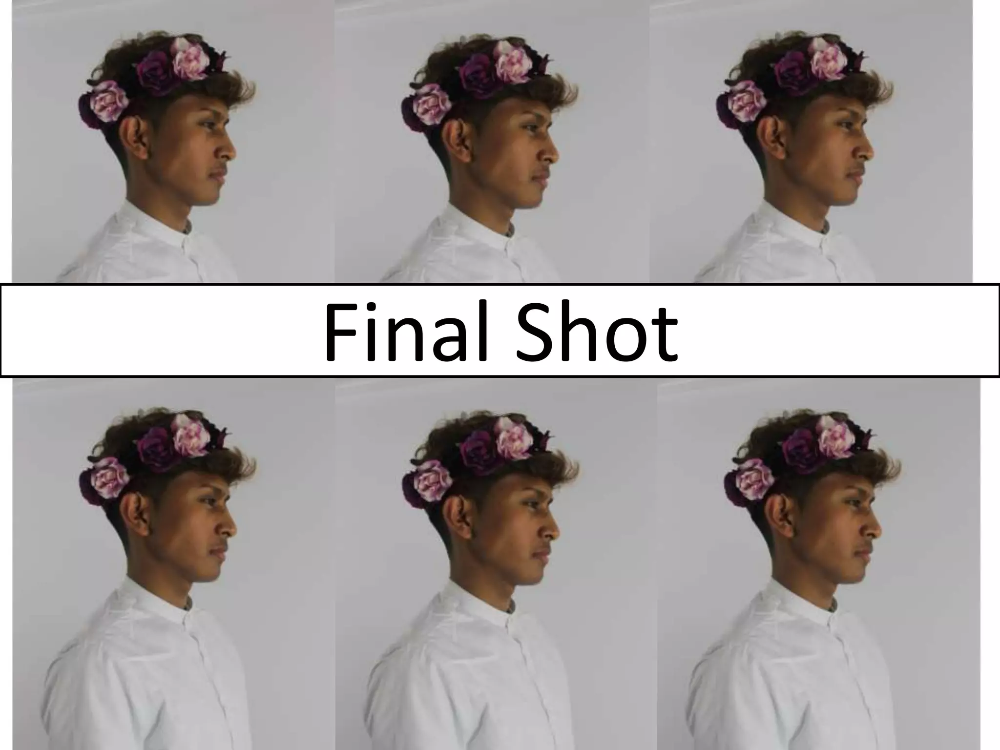 This document discusses the final shot chosen for the cover of a music magazine called "TRILL". The shot is a mid-shot of the male model facing sideways, looking away from the camera at eye-level. He is wearing a plain white button-up shirt and flower crown. The shot was chosen to present the male artist in a feminine way and make him seem mysterious. Other shots were rejected for being out of focus or having distracting elements like a jacket.