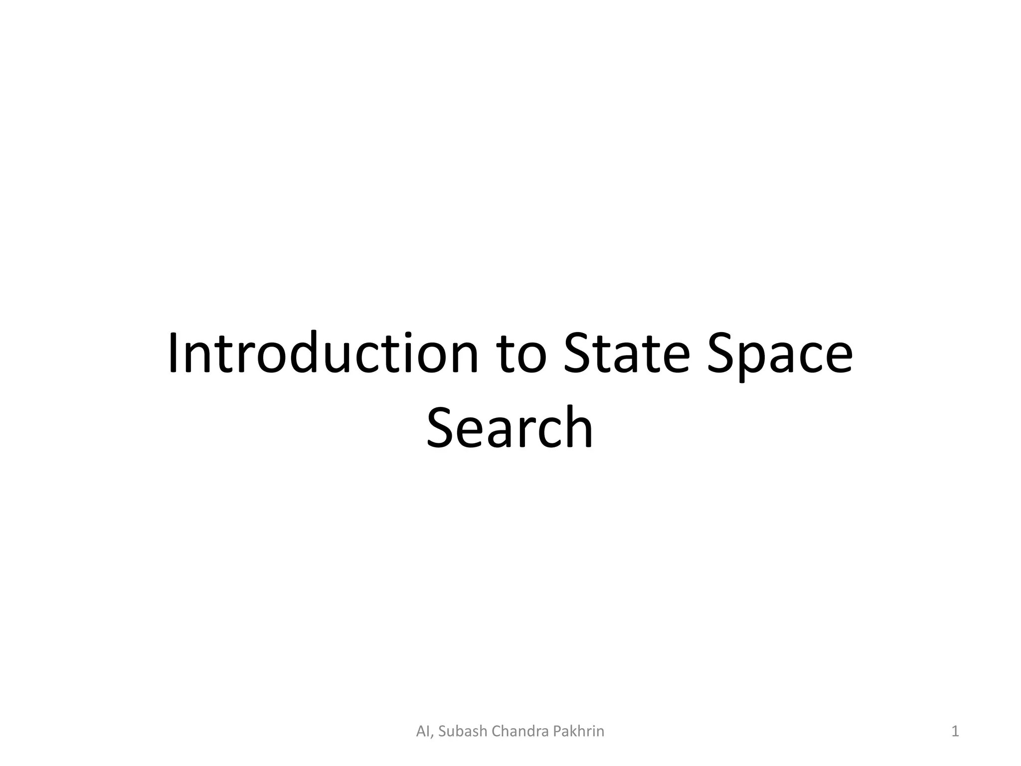 The document provides an introduction to state space search problems and algorithms. It discusses key concepts like the state space representation, initial and goal states, actions/operators that transform states, and different search strategies. Specific examples covered include the vacuums world problem, towers of Hanoi, water jugs problem, and the 8 queens puzzle. The document also introduces production systems and how they can be used to represent state space search problems.