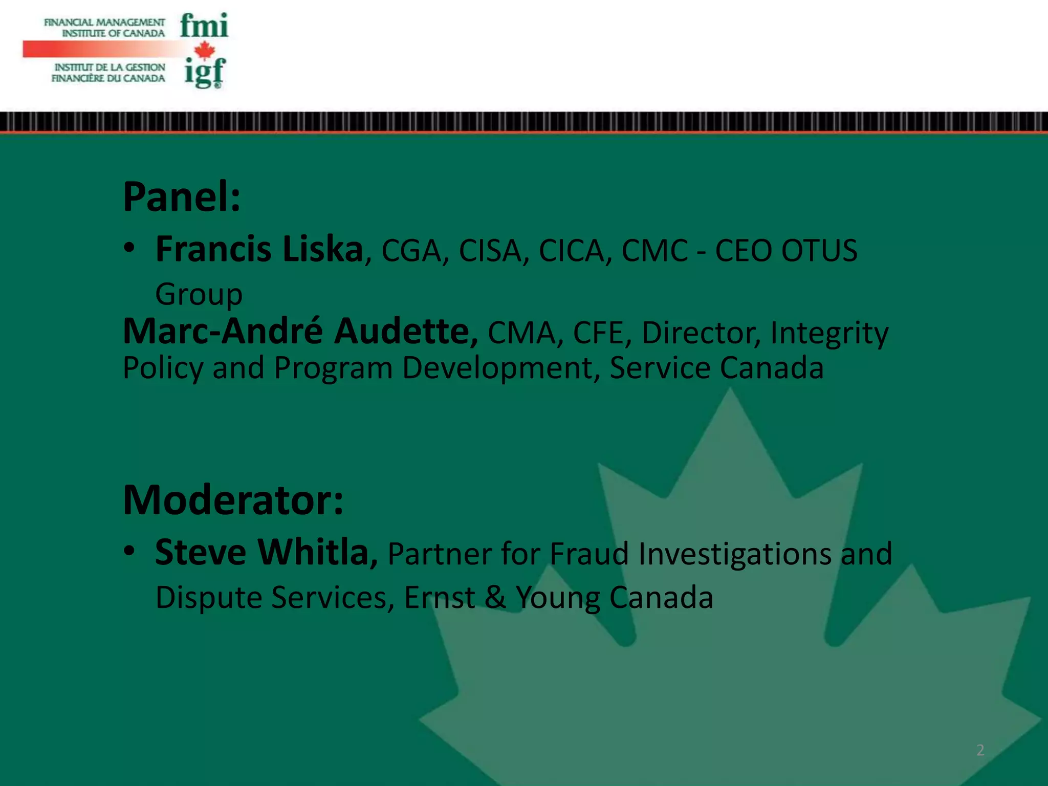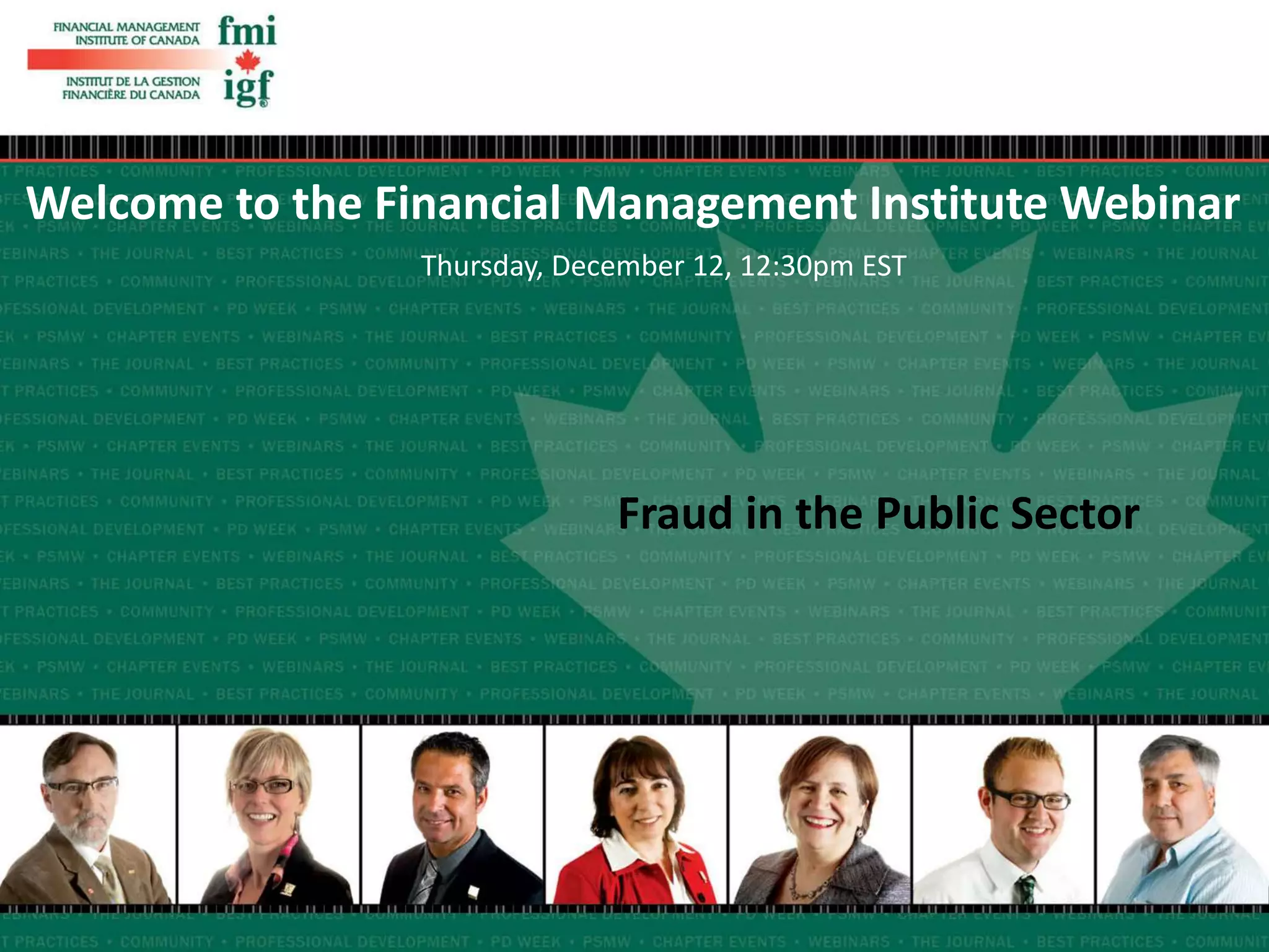 This document summarizes a webinar on fraud in the public sector. The webinar discusses the definition of fraud, sectors and industries most commonly impacted by fraud, who typically commits fraud, and reasons why fraud occurs. Specific examples of potential public sector fraud in Canada are provided. The webinar also outlines steps that can be taken to reduce fraud risk, such as establishing clear roles and responsibilities, implementing appropriate prevention and detection controls, and regularly communicating fraud management results. Common fraud detection methods and key elements of an effective fraud risk management program are also summarized.