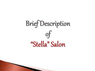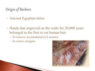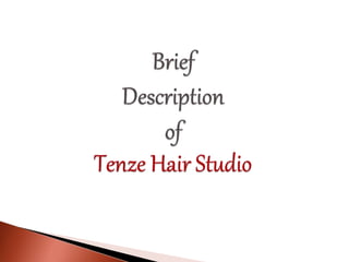 The document provides information about the history of hair salons and barber shops, as well as details about three hair salon businesses - Stella Salon, Tenze Hair Studio, and their competitors. It discusses how ancient Egyptians were the first to cut human hair for religious purposes. It then outlines the origins and evolution of barber shops from ancient Greece to modern unisex shops. The document also provides histories of the three salons, their services, revenues, locations, and competitors. Stella Salon faced challenges after relocating, so the owner switched to a home business. Tenze Hair Studio experienced success through systematic management, advertising, and differentiated products compared to competitors. Both businesses compete in an industry with