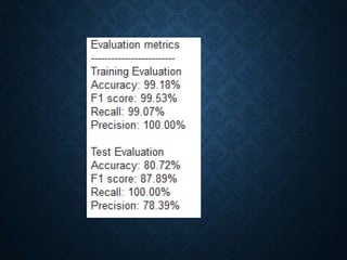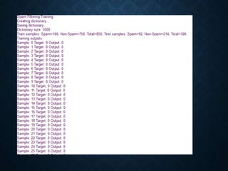 The document presents a presentation on spam email detection. It introduces the topic and defines spam emails. It then discusses using a naïve Bayes classifier to classify emails as spam or not spam based on feature vectors. It identifies problems caused by spam emails and the objectives of detection. It reviews literature on spam prevention. The document outlines the project scope, requirements, feasibility study, testing approach using datasets, and output. It concludes that the method can effectively classify emails but may have limitations when dealing with large volumes of emails.