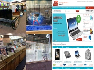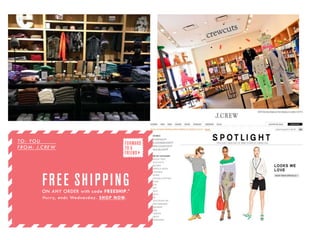 This document discusses strategies for integrating advertising and promotion across brick-and-mortar and online retail stores. It analyzes examples from J. Crew and Modell's Sporting Goods. Retailers can maximize customer services and purchasing experiences by coordinating in-store and online promotions, merchandising, and advertisements. Effective tactics include sales, rewards programs, product sampling/try-ons, organized displays, social media ads, and apps to connect physical and digital shopping. Integrating these elements consistently across channels can improve the customer experience and drive sales both online and in-stores.