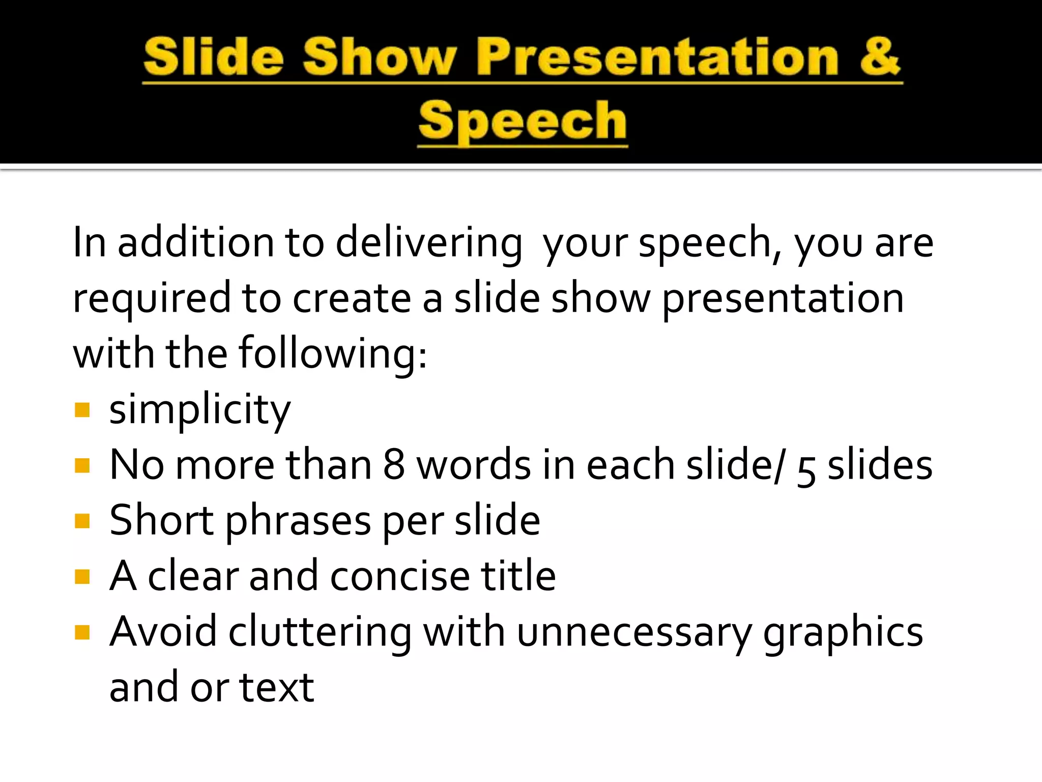 The document provides guidelines for creating a slide show presentation to accompany a speech. It specifies that the slide show should have 5 slides with no more than 8 words on each slide. Short phrases and a clear, concise title are recommended. Slides should use neutral colors and the same background color. Images should be clear and easy to see. The presentation should be saved in multiple locations. No sound, video, or unnecessary graphics/text are allowed. The outline specifies including an introduction, thesis, body with stories and humor, and conclusion with a toast reinstating the main point.