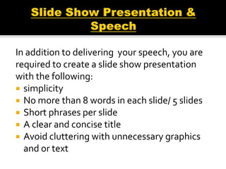The document provides guidelines for creating a slide show presentation to accompany a speech. It specifies that the slide show should have 5 slides with no more than 8 words on each slide. Short phrases and a clear, concise title are recommended. Slides should use neutral colors and the same background color. Images should be clear and easy to see. The presentation should be saved in multiple locations. No sound, video, or unnecessary graphics/text are allowed. The outline specifies including an introduction, thesis, body with stories and humor, and conclusion with a toast reinstating the main point.