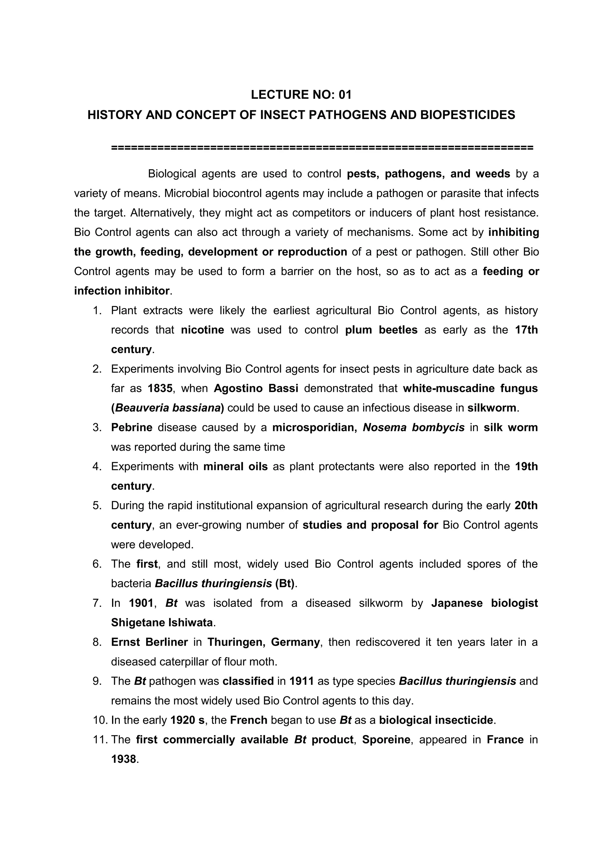 This document provides an overview of biopesticides and their classification. It defines biopesticides according to the USEPA and European Union as naturally occurring substances or microorganisms that control pests. It then classifies common biopesticide types as insect viruses, bacteria, entomopathogenic fungi, entomopathogenic nematodes, and other microorganisms. Specifically, it outlines commonly used insect viruses like NPV and GV, the bacteria Bacillus thuringiensis, and fungal agents like Beauveria bassiana and Metarhizium anisopliae.