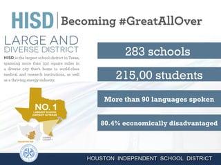 The document outlines a comprehensive strategy for transforming education, emphasizing the need for leadership, effective technology integration, and support for economically disadvantaged students across 283 schools serving over 215,000 students. It discusses essential components such as curriculum development, professional training, and ensuring student privacy and security in the digital age. The plan calls for a cultural shift toward embracing digital transformation in learning while coordinating strategies among educational systems and technology vendors.