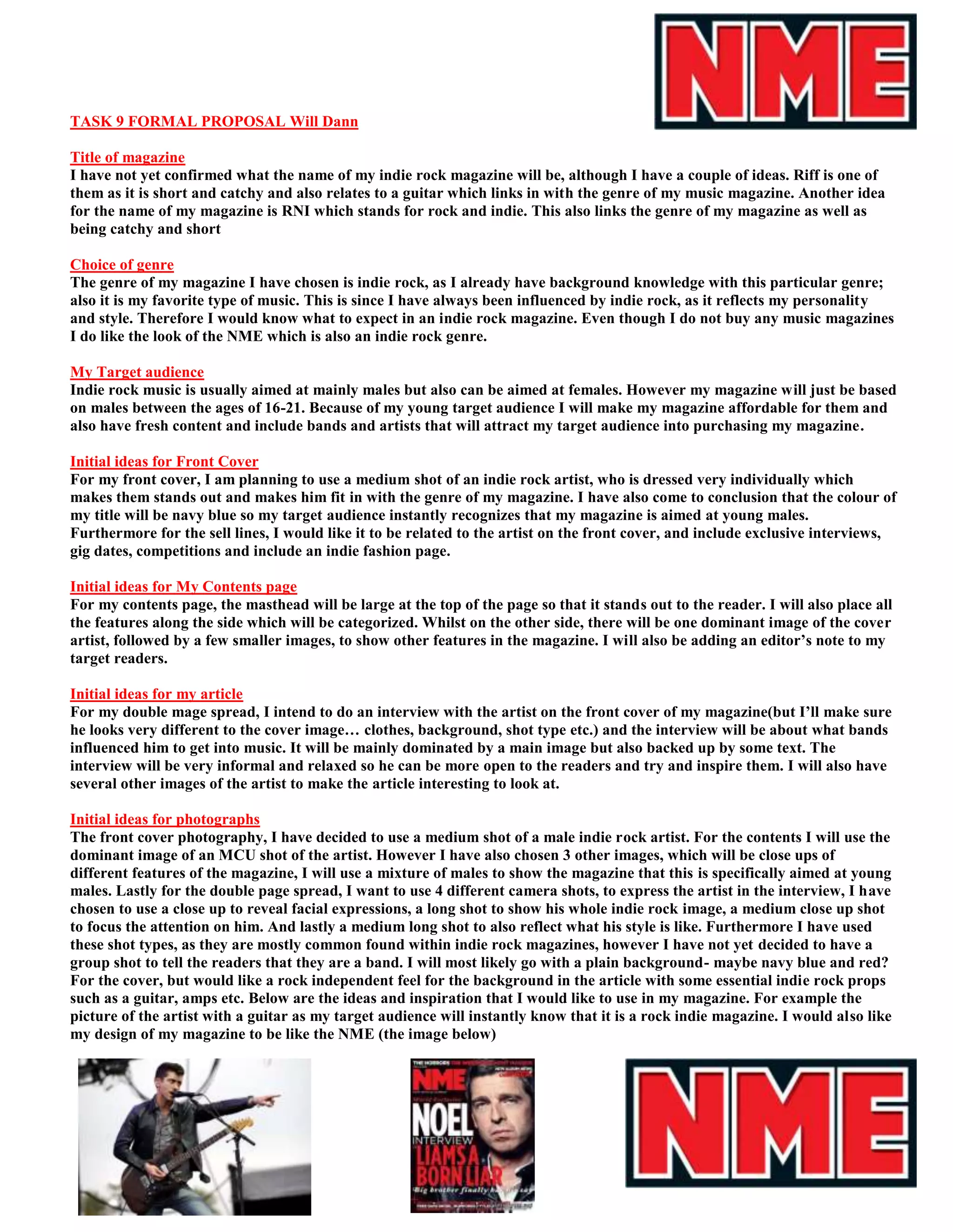 Will Dann is proposing an indie rock magazine targeted at males aged 16-21. Some potential names for the magazine are "Riff" and "RNI" which both relate to rock music. The magazine will focus on the indie rock genre which is the proposer's favorite type of music. Initial ideas for content include featuring indie rock artists on the cover and in interviews, along with information about upcoming concerts and competitions. Photographs will include shots of bands and individual artists in an indie rock style.