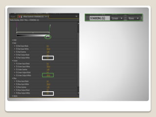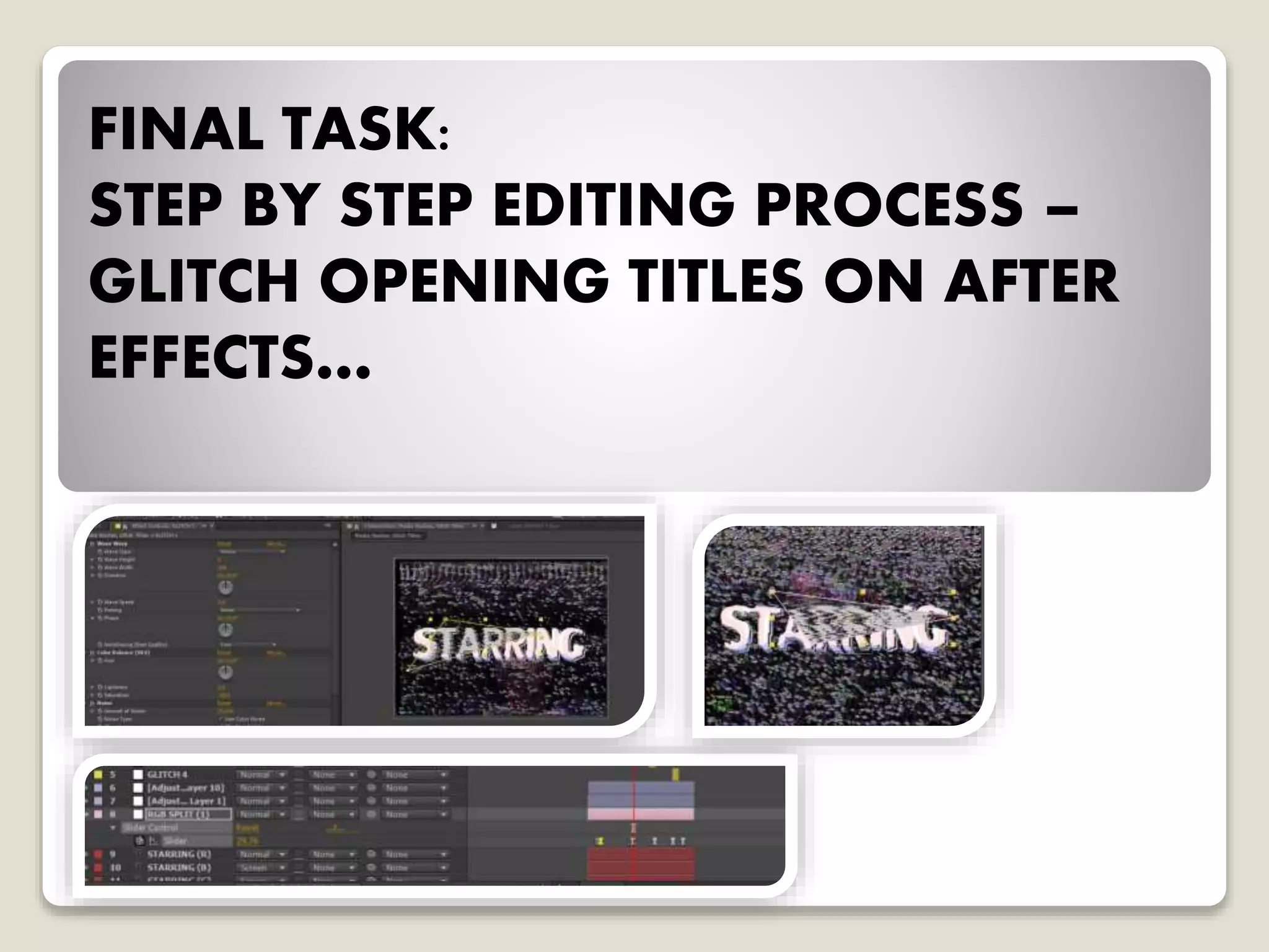 The document provides step-by-step instructions for creating glitch-style opening titles in After Effects. It discusses achieving a 4:3 aspect ratio to mimic old VHS tapes. Stock footage of glitches is imported and distorted using displacement maps. Text layers are duplicated and colored individually using color levels. A null layer is used to create an RGB split effect by animating the position of the red text layer. Glitch effects are added using adjustment layers and masking. The process is repeated for six opening title screens over a two minute sequence.