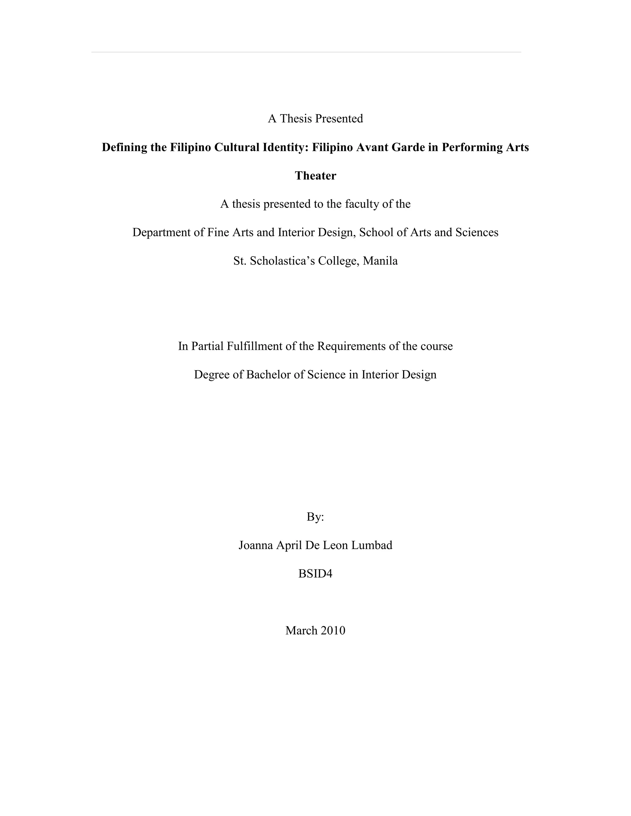 This document is a thesis presented by Joanna April De Leon Lumbad to the faculty of St. Scholastica's College in Manila for the degree of Bachelor of Science in Interior Design. The thesis explores defining the Filipino cultural identity through Filipino avant-garde in performing arts theaters. It discusses the history of performing arts theaters and Philippine theater. Through interviews with theater experts and observations of existing theaters, the thesis examines how theater design has adapted over time to different influences and seeks to determine if an avant-garde concept can help establish a uniquely Filipino style.