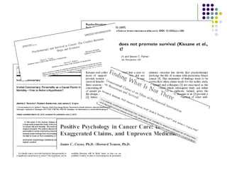 This document summarizes and critiques research on psychoneuroimmunology (PNI) and claims that psychological factors can influence cancer outcomes. It finds that PNI research often relies on weak study designs, ignores negative findings, and overstates small or insignificant positive results. Better designed studies find little evidence that stress influences cancer or that psychosocial interventions impact survival time. The document cautions against overinterpreting immune system changes without considering the system's complexity.