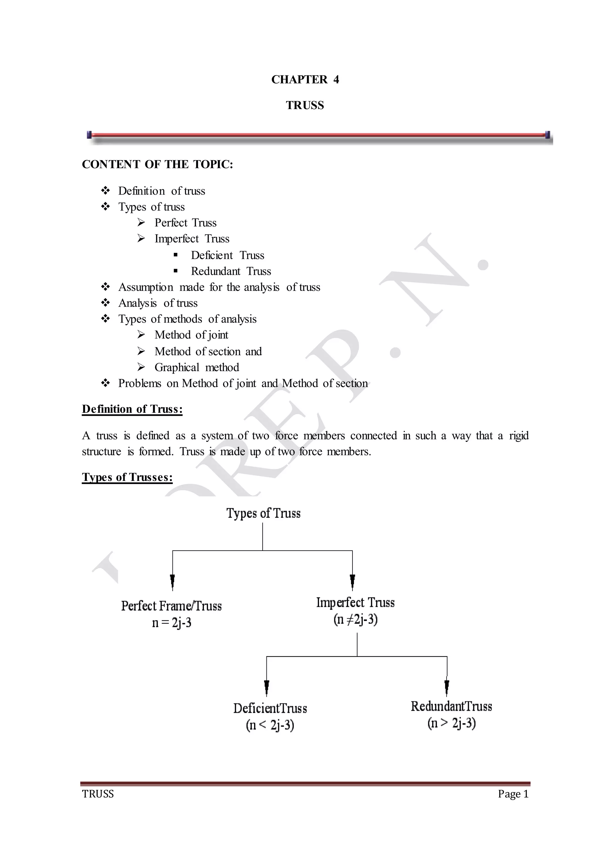 The document defines a truss as a rigid structure composed of two force members connected at joints. There are three types of trusses: perfect trusses which have just enough members to remain stable under loading, deficient trusses with too few members, and redundant trusses with excess members. The key assumptions in truss analysis are that members are pin jointed and carry only axial forces, and trusses are loaded at joints. Two common methods to analyze trusses are the method of joints, which determines member forces by analyzing joints individually, and the method of sections, which analyzes equilibrium across a cut through selected members. Several example problems demonstrate applying these analysis methods to various truss configurations.