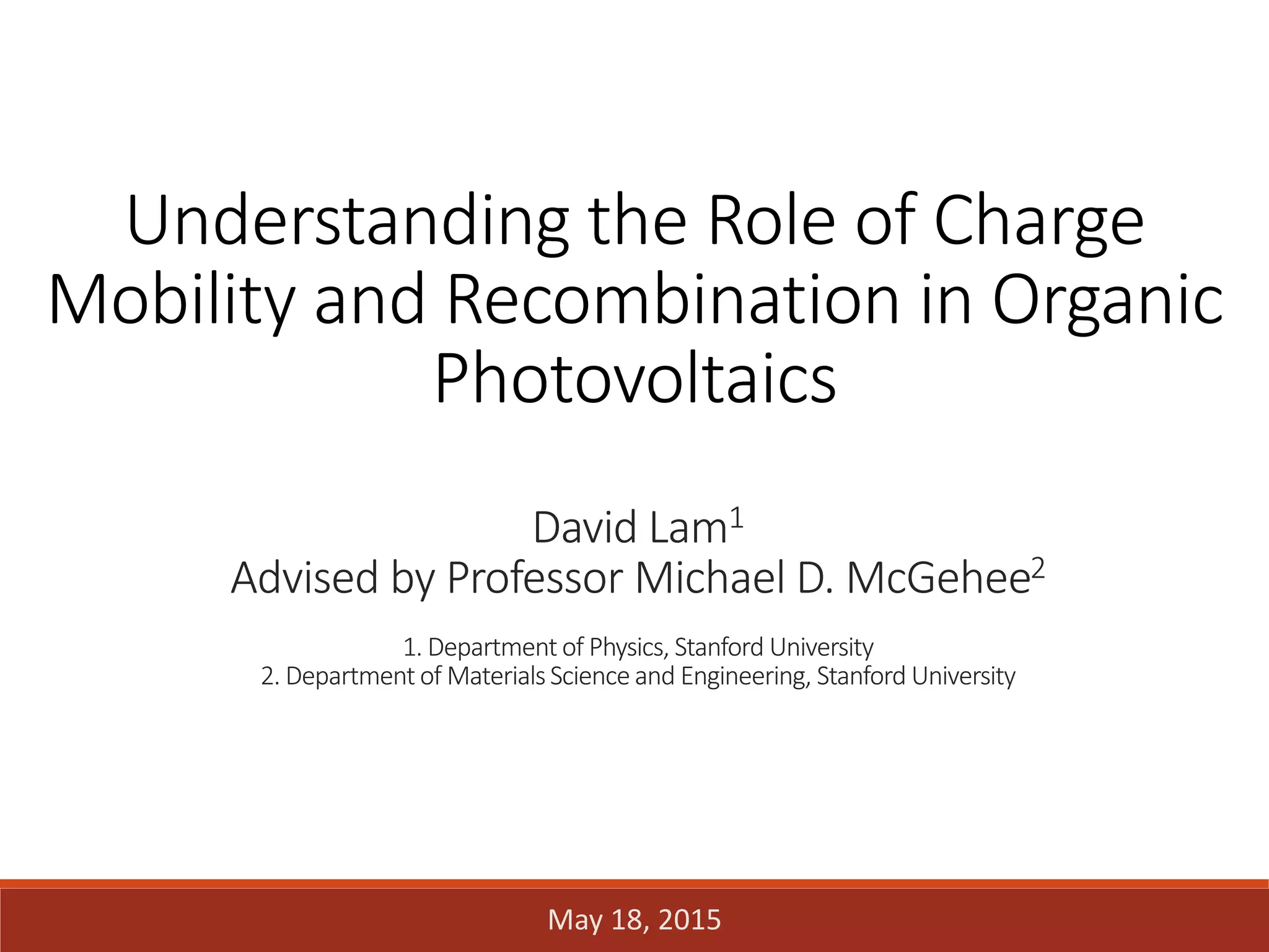 This document summarizes research into understanding charge mobility and recombination in organic photovoltaics. The research questions whether poor fill factor in thick organic photovoltaic devices can be modeled through simulation. Simulation results match experimental data and suggest bimolecular recombination reduces fill factor as thickness increases. The simulation captures device physics and finds an optimal recombination rate constant that fits experimental efficiency and fill factor values.
