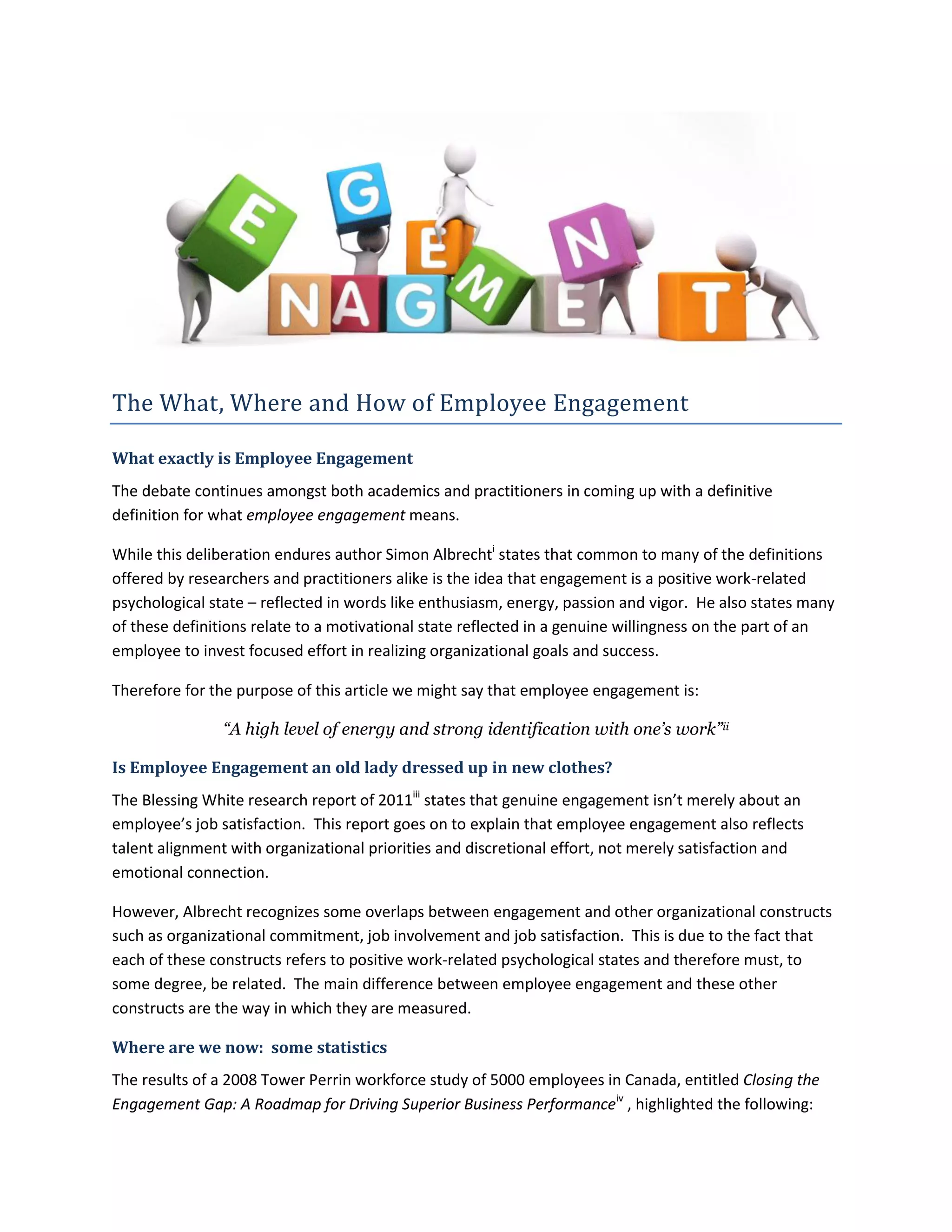 The document discusses employee engagement, including its definition, statistics on engagement levels, and factors that influence engagement. It provides examples of practices from highly engaged organizations like PCL Constructors Inc., EllisDon Corporation, and Cisco Canada. These companies focus on flexibility, open communication, employee development, and work-life balance to boost engagement. Overall the document explores what engagement means, current engagement levels, and best practices for improving engagement.