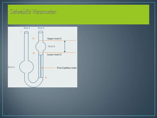 The document provides an overview of viscosity, including its definition, types, formulas, and units. It outlines various types of viscometers such as capillary, falling ball, and rotational viscometers, along with their principles, advantages, and disadvantages. Additionally, it details specific viscometers like Ostwald’s and Brookfield viscometers and their application in measuring fluid viscosity.