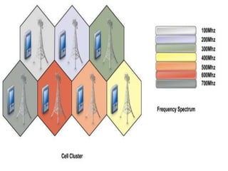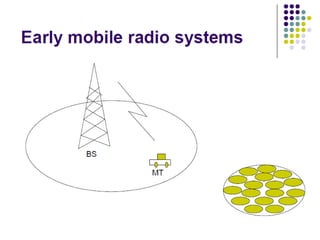 Older mobile radio systems used a single, high-powered transmitter to cover a large area, which severely limited the number of simultaneous users to around 12 over 1000 square miles. The cellular concept was developed to address this problem through the use of many smaller cells with low-powered transmitters, each covering a small area and reusing the same radio frequencies in cells farther apart to increase capacity and allow for millions of subscribers. Cells are modeled as hexagons to efficiently cover service areas without gaps and facilitate analysis, though actual coverage areas are irregularly shaped.