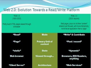This document discusses the history and evolution of Web 2.0 technologies and how they are used. It defines Web 2.0 as a second generation of web services that allow for more collaboration and sharing of information online. Examples of Web 2.0 technologies covered include blogs, wikis, social networking sites, photo and video sharing sites, and how these have applications for learning, research, and libraries. The document also discusses how concepts from Web 2.0 can be applied to libraries to create a Library 2.0 model with more user-centered services and participation.