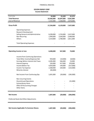 This document provides financial information for Devon Energy Corp for the years ending 31 December 2014, 2013 and 2012. It includes balance sheets, income statements and statements of cash flows. The balance sheet shows the company had total assets of $50.6 billion in 2014 compared to $42.9 billion in 2013. Net income increased to $1.6 billion in 2014 from a net loss of $20 million in 2013. Cash flow from operations was negative $8.2 billion in 2014 compared to negative $4 billion in 2013.