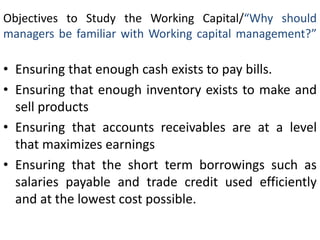 Working capital refers to a company's short-term assets and liabilities involved in day-to-day operations. It includes current assets like inventory, cash, and receivables, as well as current liabilities like payables and short-term debt. Managing working capital effectively ensures a company has enough cash to pay bills on time, maintains optimal inventory levels, collects receivables efficiently, and uses short-term financing at low cost. Both excess and inadequate working capital can hurt a business, so companies must forecast needs carefully based on factors like industry, sales, and production cycles.