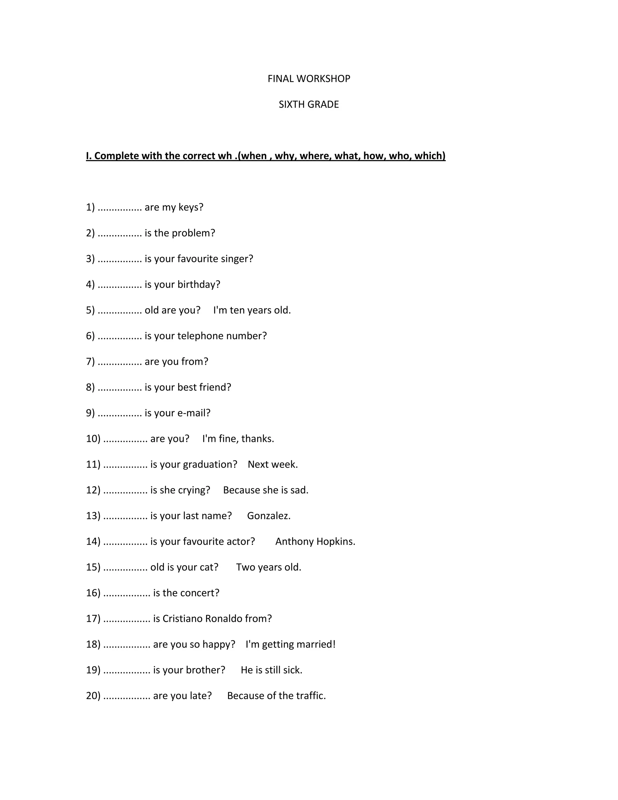 The document contains a final workshop for sixth grade students. It includes exercises on completing questions with wh- words, asking wh- questions based on sentences, completing sentences with verbs like is/are/has/have, describing people, choosing opposite adjectives, using prepositions, matching words to pictures, answering questions using yes/no phrases, reading and answering questions about short stories, and filling in a crossword puzzle with clues. The passages are about butterflies going through different life stages and a family.