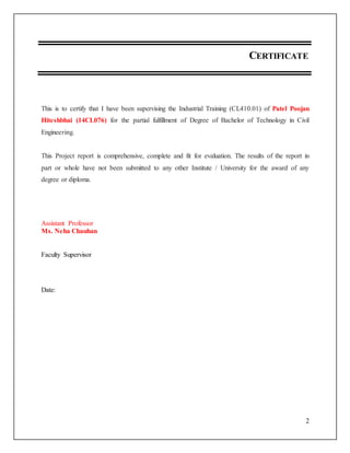 The document provides details about a training project involving laying RCC drainage gravity line by microtunneling method. It describes the project scope, which involves providing and laying 1400/1800 mm diameter RCC jacking pipes over 5.1 km between Gorwa A.P.S. and Shrenikpark Junction in Vadodara, Gujarat. It also provides information about microtunneling technology and its advantages over traditional open-cut construction methods. The training involved various construction activities like RCC pipe casting, shaft construction, MTBM launching, jacking and receiving.