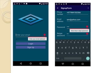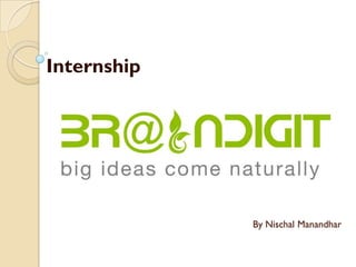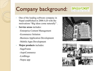 The document summarizes an internship at a leading software company in Nepal. The internship's objectives were to gain real-world experience, learn advanced techniques, and develop applicable skills. Over a 2 month period, the intern was assigned to an Android team of 5 members. They received training in Android development and were assigned a project to build a news app that scraped and displayed data from websites using Jsoup. The intern tested the app on various Android devices and concluded the internship gained skills in areas like design, threads, fragments, and using external libraries.