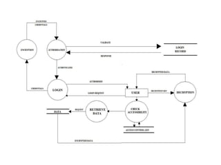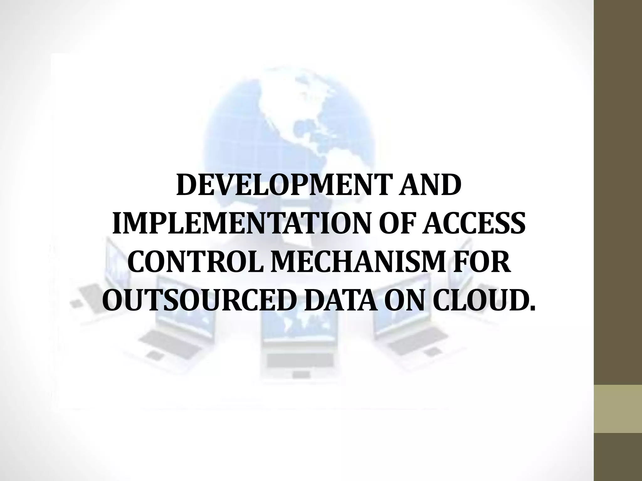 This document outlines a project to develop and implement an access control mechanism for outsourced data on the cloud. The project has four modules: a supporting application, service development, encryption/decryption, and role-based access. It discusses key terms like access control, access control models, outsourced data, and cloud computing. The system works by allowing a data owner to encrypt and outsource data to the cloud, which then processes and forwards the data to authorized users based on an agreed access policy.