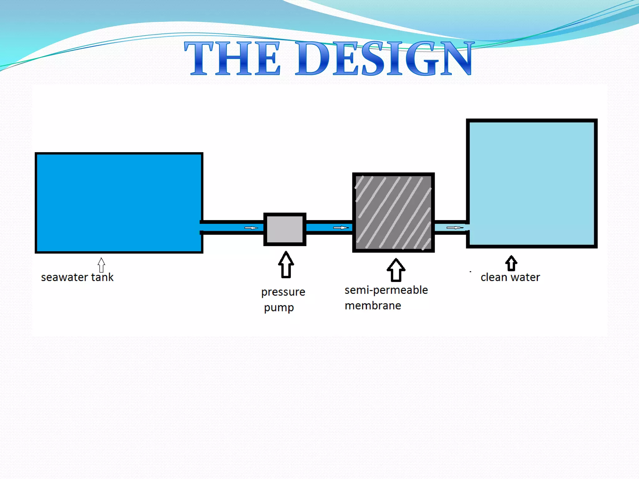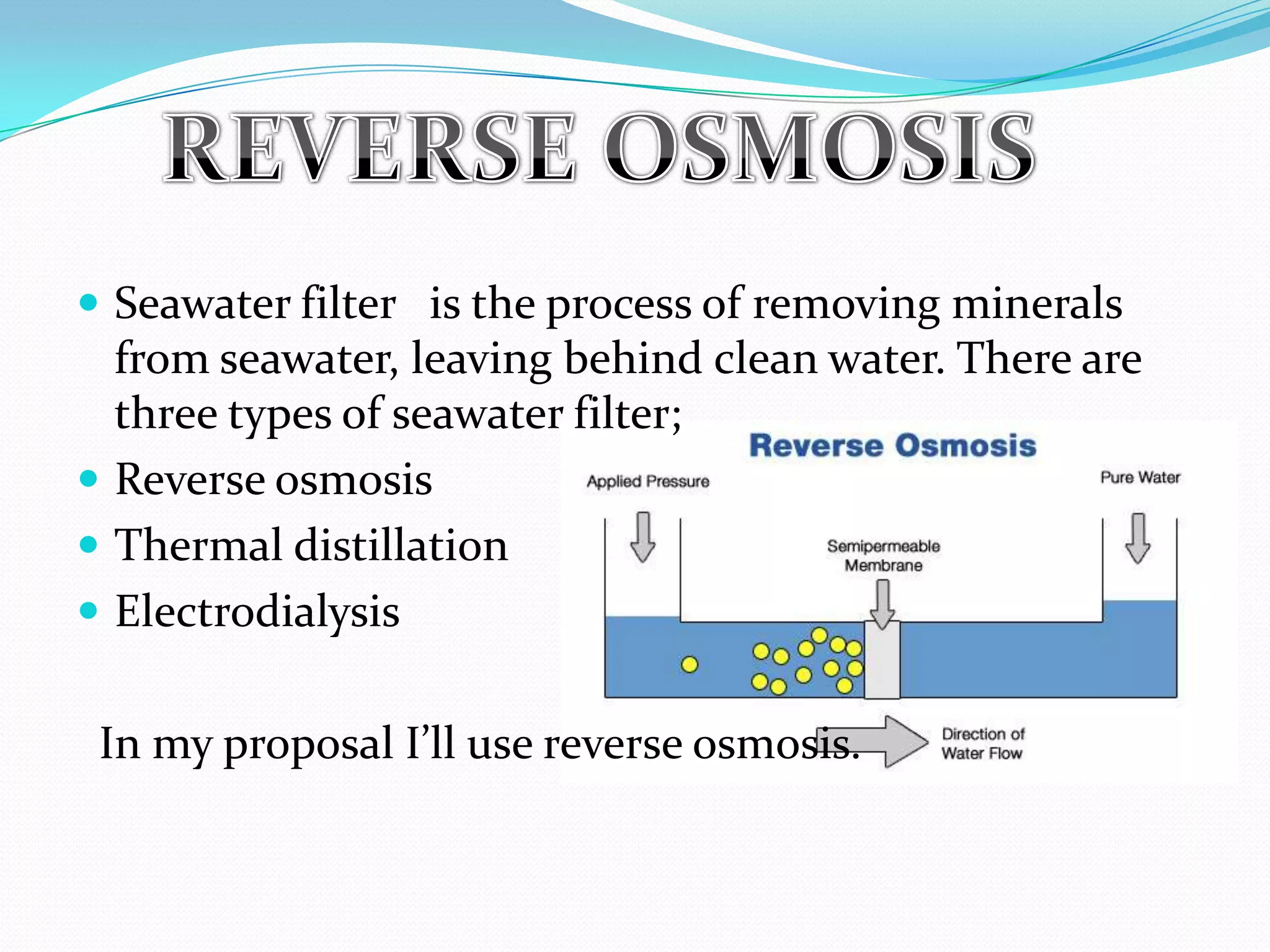 The document discusses a proposal to use reverse osmosis to filter seawater into pure water. It describes reverse osmosis as a membrane filtration method that uses pressure to force seawater through a selective membrane, allowing water to pass through while retaining dissolved salts and other solutes. The proposal outlines using a water tank, plastic hose, pressure pump, and membrane to filter seawater. The budget for the project is estimated to be $250 and a team is needed but it can also be built individually, though it will take more time. The goal is to produce pure, tasty water from seawater in an environmentally friendly way without chemicals or electricity.